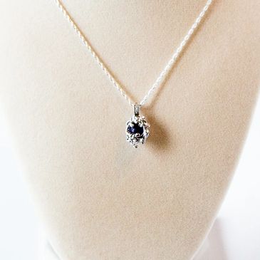 This sophisticated round pendant features decorative silver detailing around a dark blue resin sphere that encases cremains. It hangs from a delicate 16‑inch silver chain, creating a timeless memento. Resin can be tinted in different colours to suit your preference.