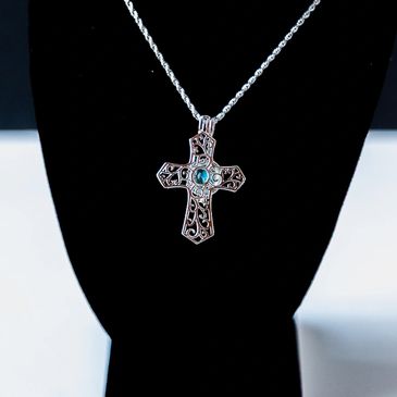 An ornate filigree cross pendant made from polished silver, paired with a 16‑inch chain. The turquoise resin at the center is infused with your pet’s cremains, blending faith and remembrance into a beautiful accessory. Alternative resin colors can be requested.